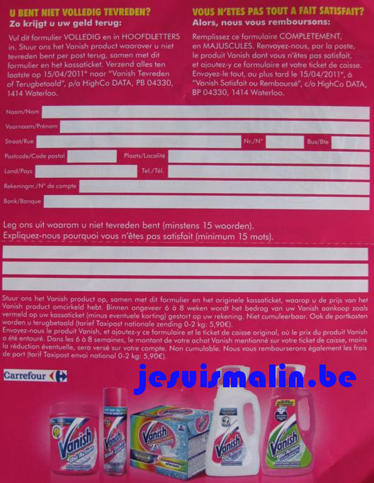 Renvoyez le formulaire complété, votre ticket de caisse et le produit Vanish au plus tard le 15/04/11 à :