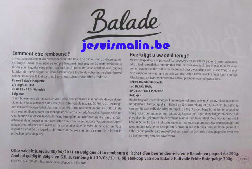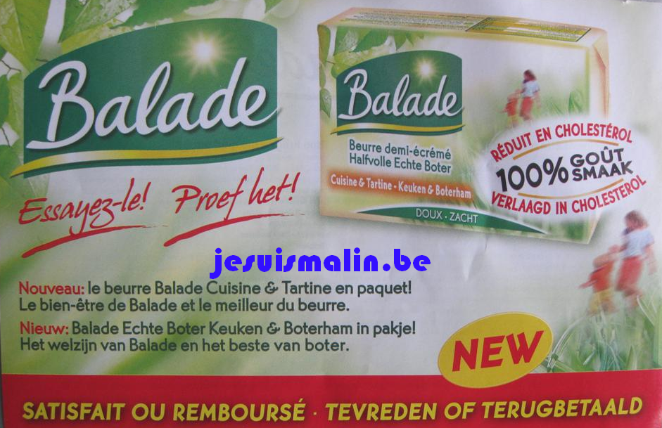 Votre achat d’un beurre demi-écrémé Balade est satisfait ou remboursé jusqu’au 30/06/11.