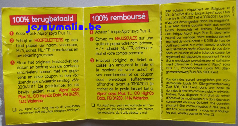 Achetez entre le 17/01/11 et le 30/04/11 une brique d’Alpro soya Plus 1L et votre achat sera 100% remboursé!