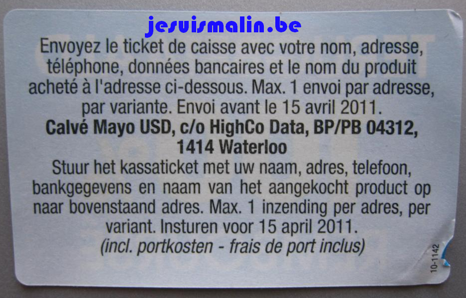Jusqu’au 14 avril 2011, votre achat d’une mayonnaise Calvé (aux œufs, au citron ou Dijonnaise) est 100% remboursé!
