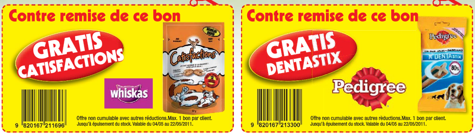 Du 04/05/11 au 22/05/11, recevez gratuitement dans votre magasin Hubo avec rayon animaux des biscuits pour chats Catisfactions de Whiskas et un Pedigree Dentastix pour chiens.