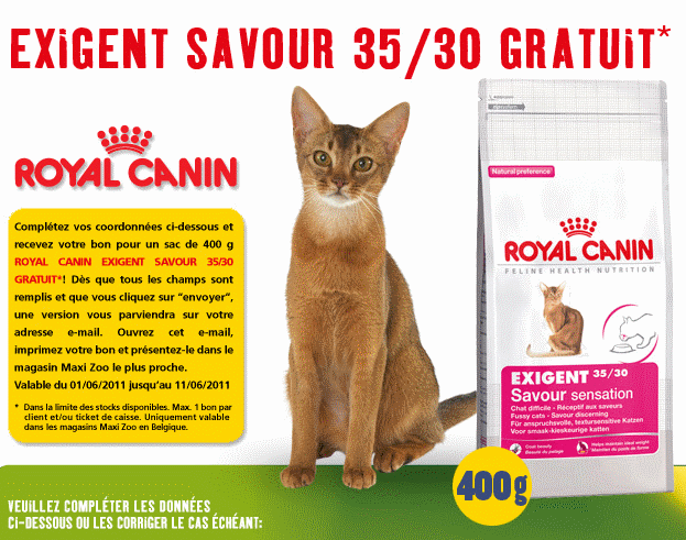 Du 01/06/11 au 11/06/11, rendez-vous dans votre magasin Maxi Zoo avec votre bon et recevez un sac de nourriture de 400 g Royal Canin Exigent Savour 35/30 gratuitement !
