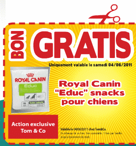 Ce 04/06/11, rendez-vous dans votre magasin Tom&Co et recevez gratuitement un « Educ » snacks pour chien de Royal Canin gratuitement !