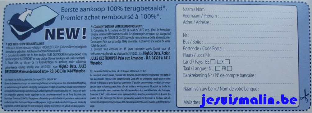 Complétez le formulaire au dos de la boîte, joignez-y votre ticket de caisse et envoyez le tout dans les 15 jours suivant votre achat (et au plus tard le 31/12/11) à :