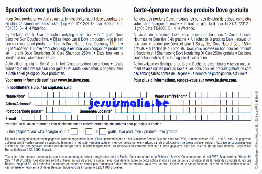 Complétez votre carte épargne et joignez-y le(s) ticket(s) de caisse avec le(s) produit(s) Dove et renvoyez le tout pour le 31/12/12 à :
