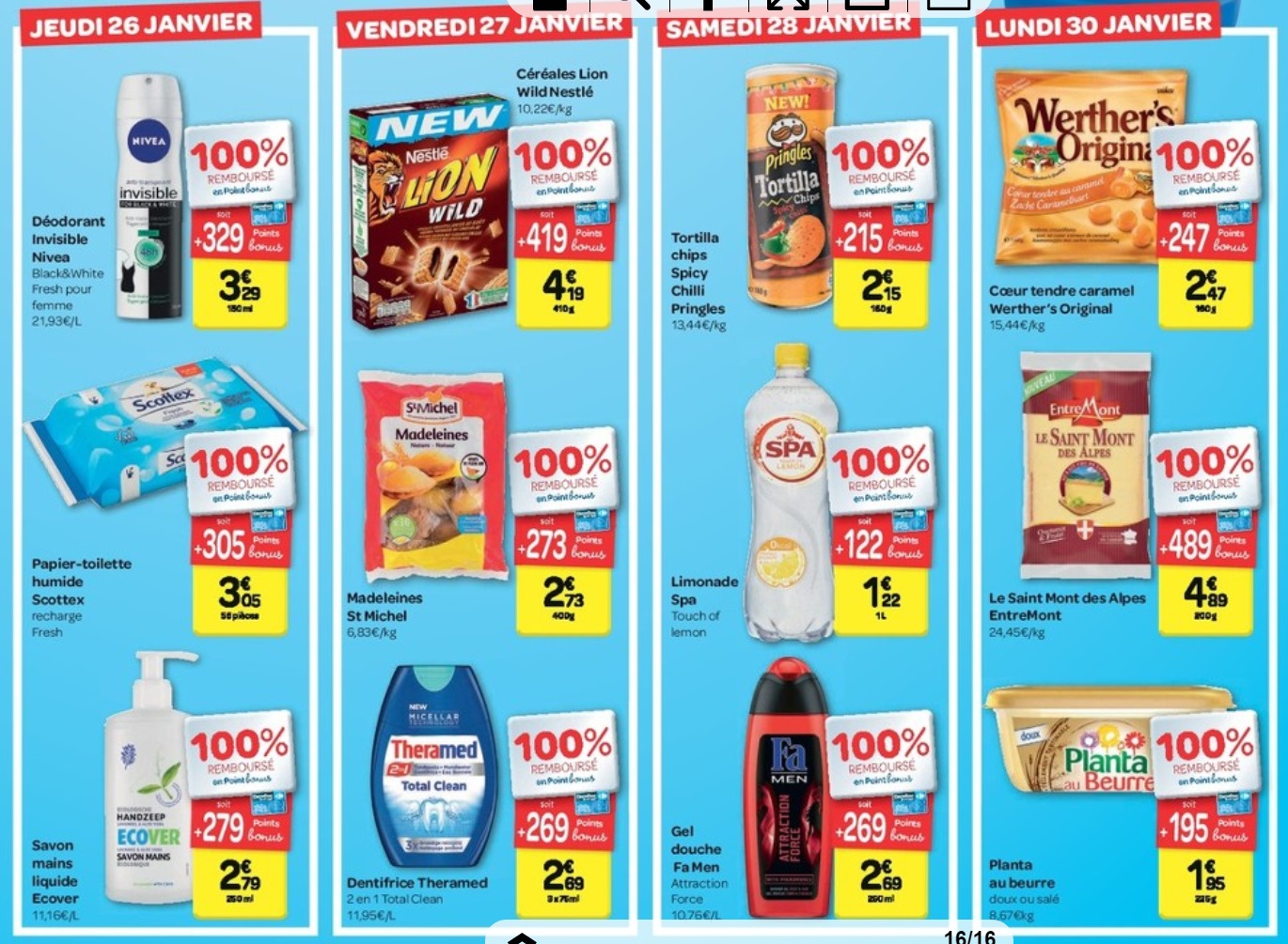 Chaque jour entre le 25 et 30 janvier 2017, trois produits sont remboursés en points Bonus chez Carrefour !