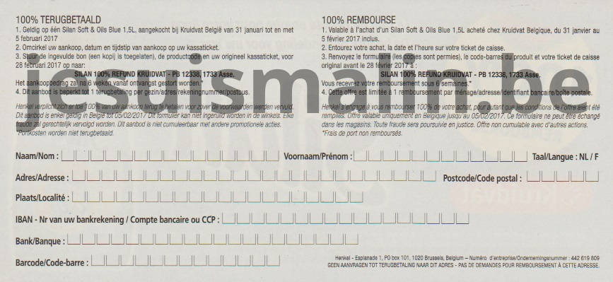 Renvoyez le formulaire complété, le code-barres du produit et votre ticket de caisse avant le 28/02/2017 à :